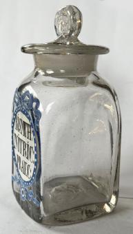 Signatur / Beschriftung: "Bismuth: Nitric: praeci" (Bismutum Nitricum praecipitatum - Wismuth Niederschlag oder Basisch-salpetersaures Wismuthoxyd). Angewendet äußerlich als Kehlkopfpulver, innerlich bei Diarrhöen Schwindsüchtiger.
